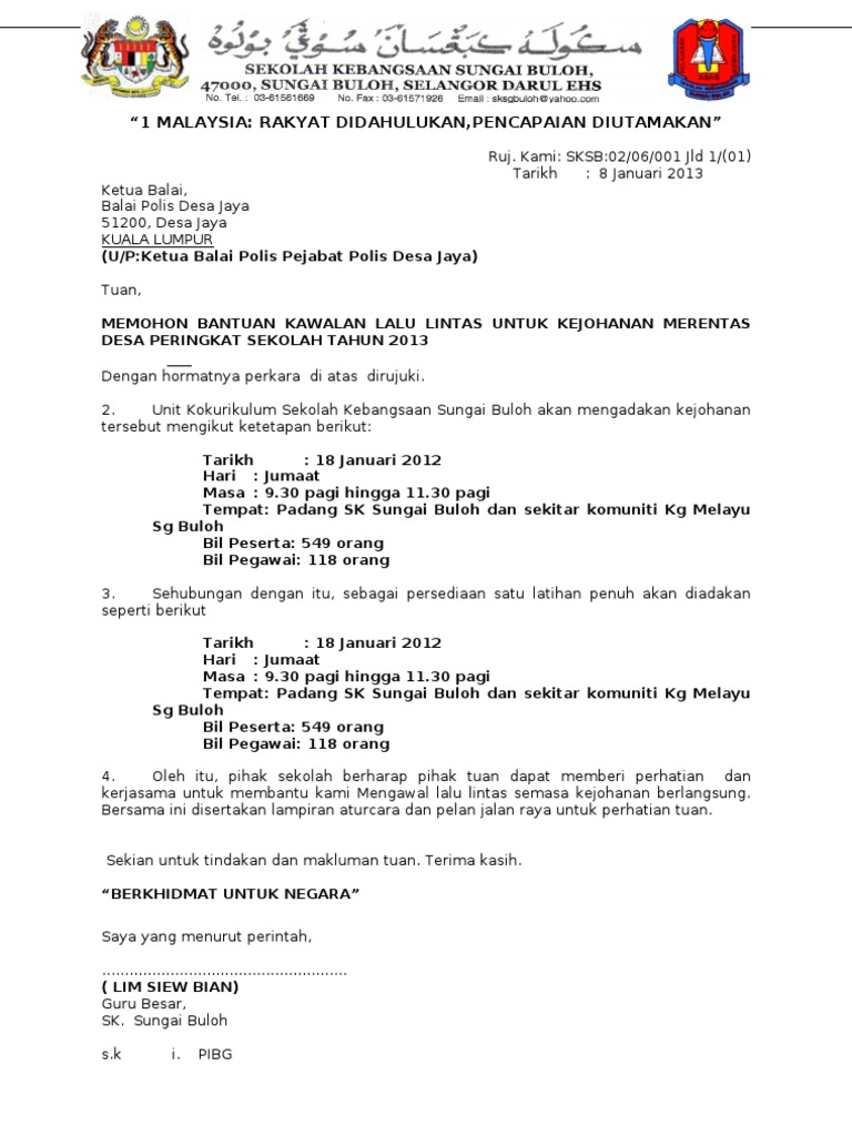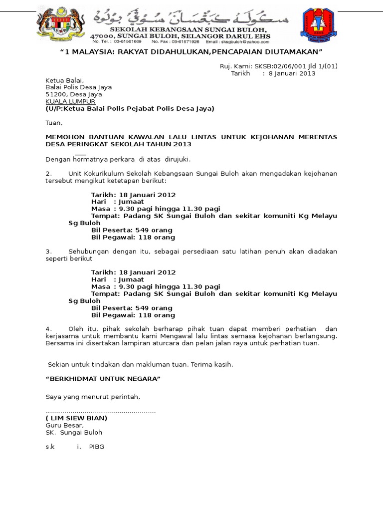 Ketua Polis Daerah Ibu Pejabat Polis Daerah SEBERANG PERAI UTARA Tuan KEJOHANAN OLAHRAGA MSSPP KE 53 2007 Dengan hormatnya saya diarah merujuk perkara di atas. Sekolah kebangsaan putrajaya presint 11 1 jalan p11 j1 presint 11 62300 putrajaya tel. Ketua Balai Polis Pejabat Polis Kota Setar Tuan MEMOHON BANTUAN KAWALAN LALU LINTAS UNTUK PERARAKAN SEMPENA SAMBUTAN MAULIDUR RASUL PERINGKAT SEKOLAH TAHUN 2014.